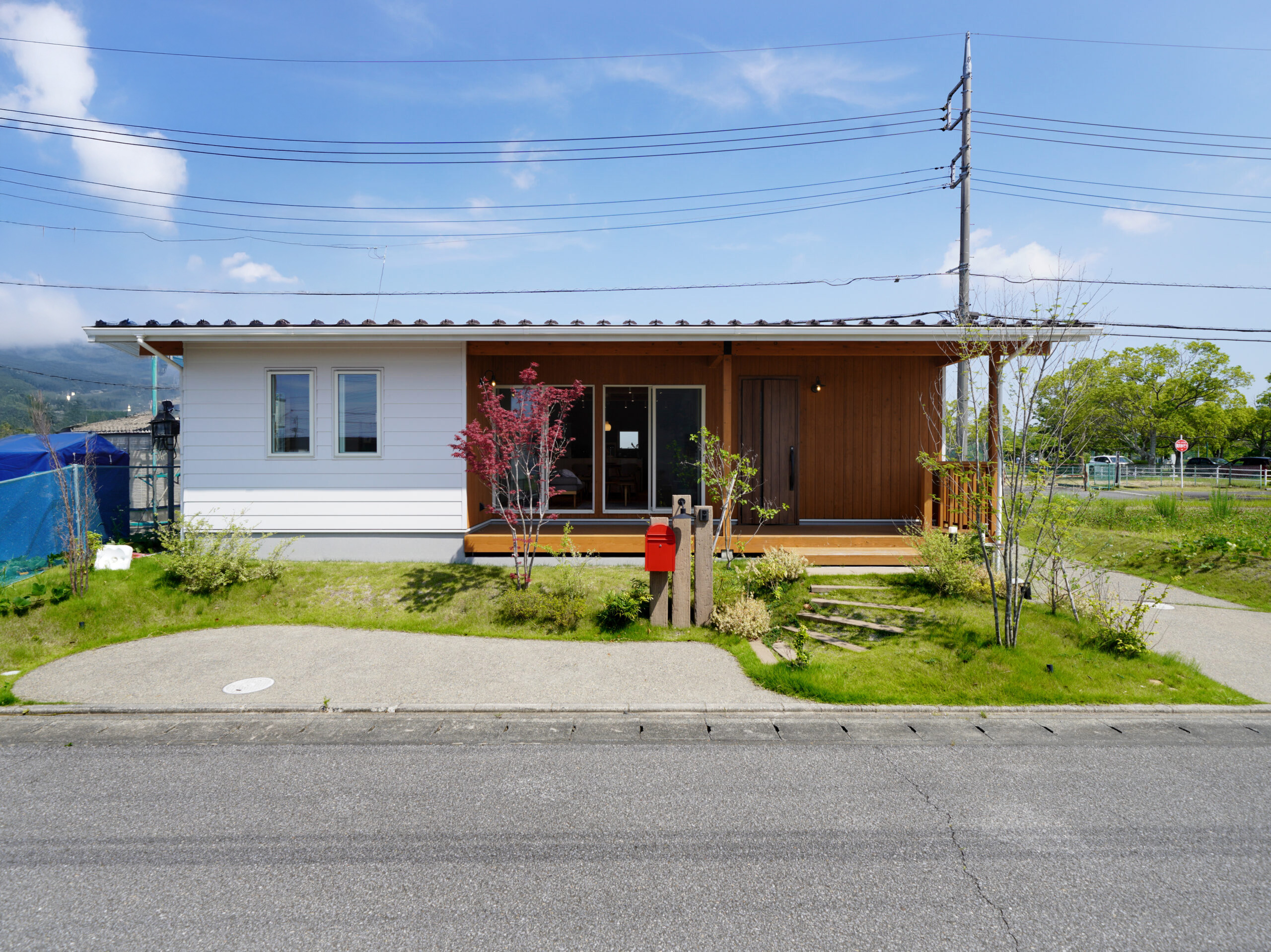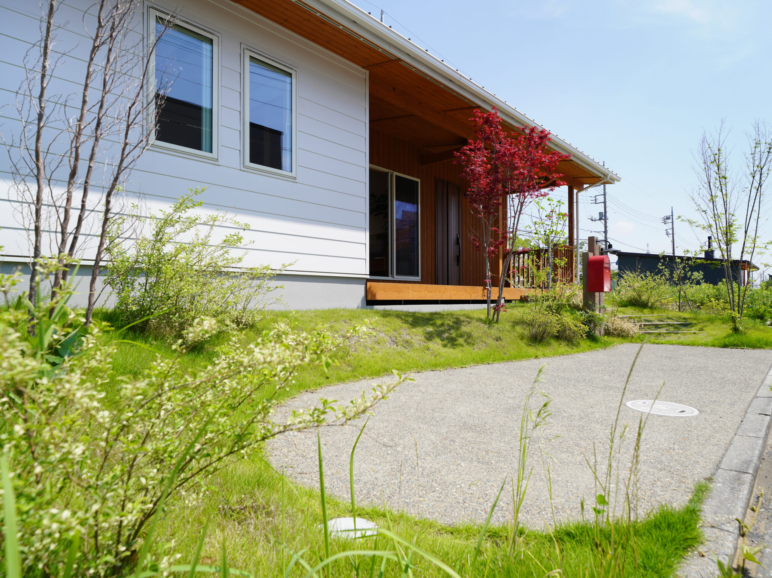 白い外壁はラップサイディング調で、水平ラインが美しい端正な佇まい。高低差を活かしたナチュラルな外構、室内は“和×北欧”のジャパンディスタイルで統一しています。
