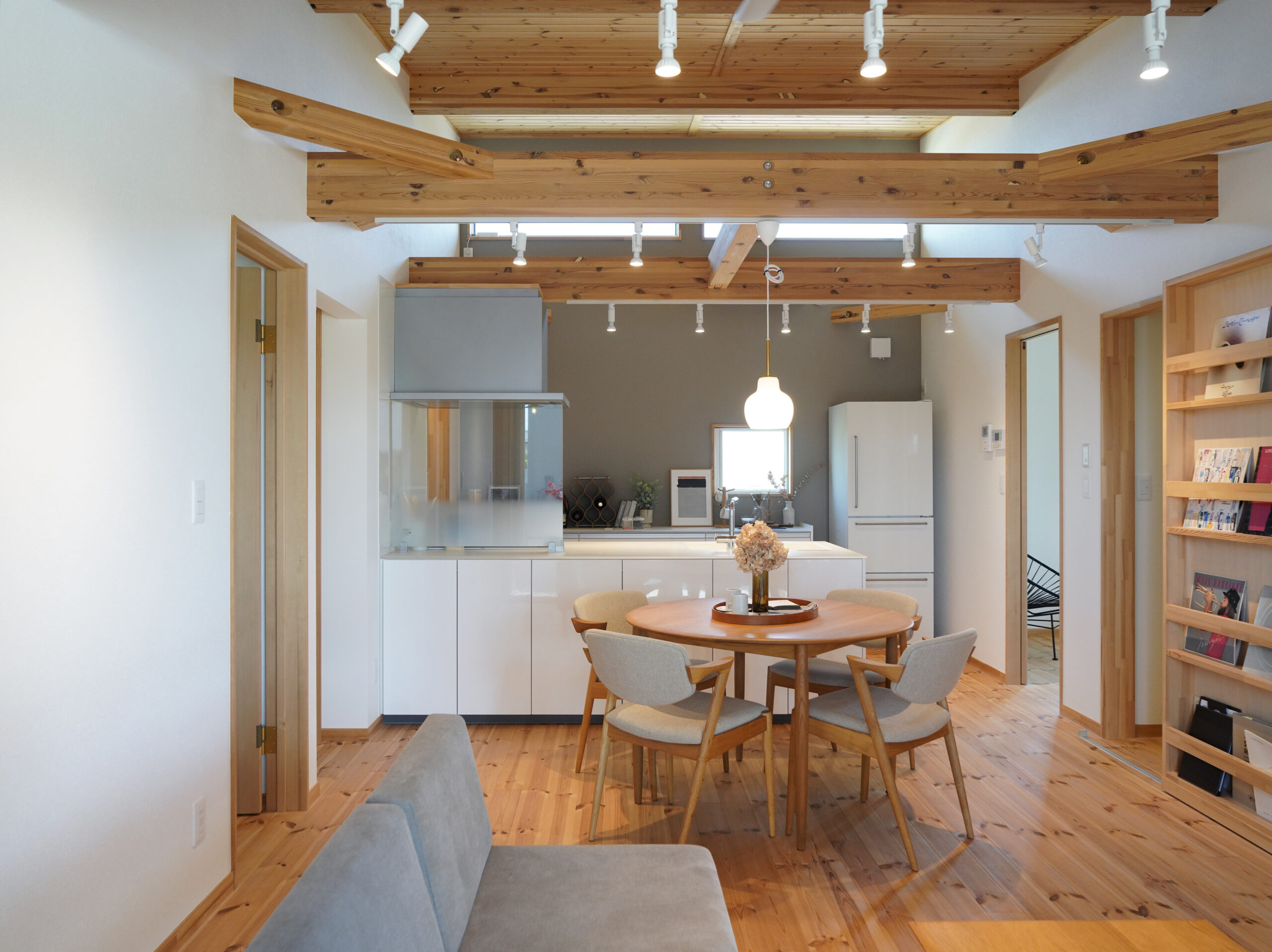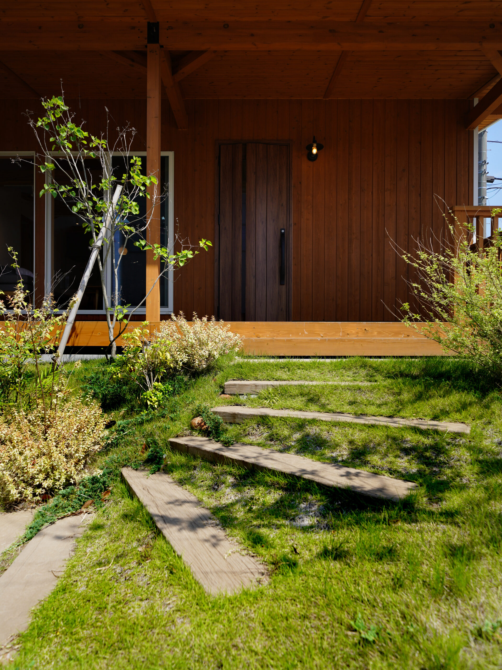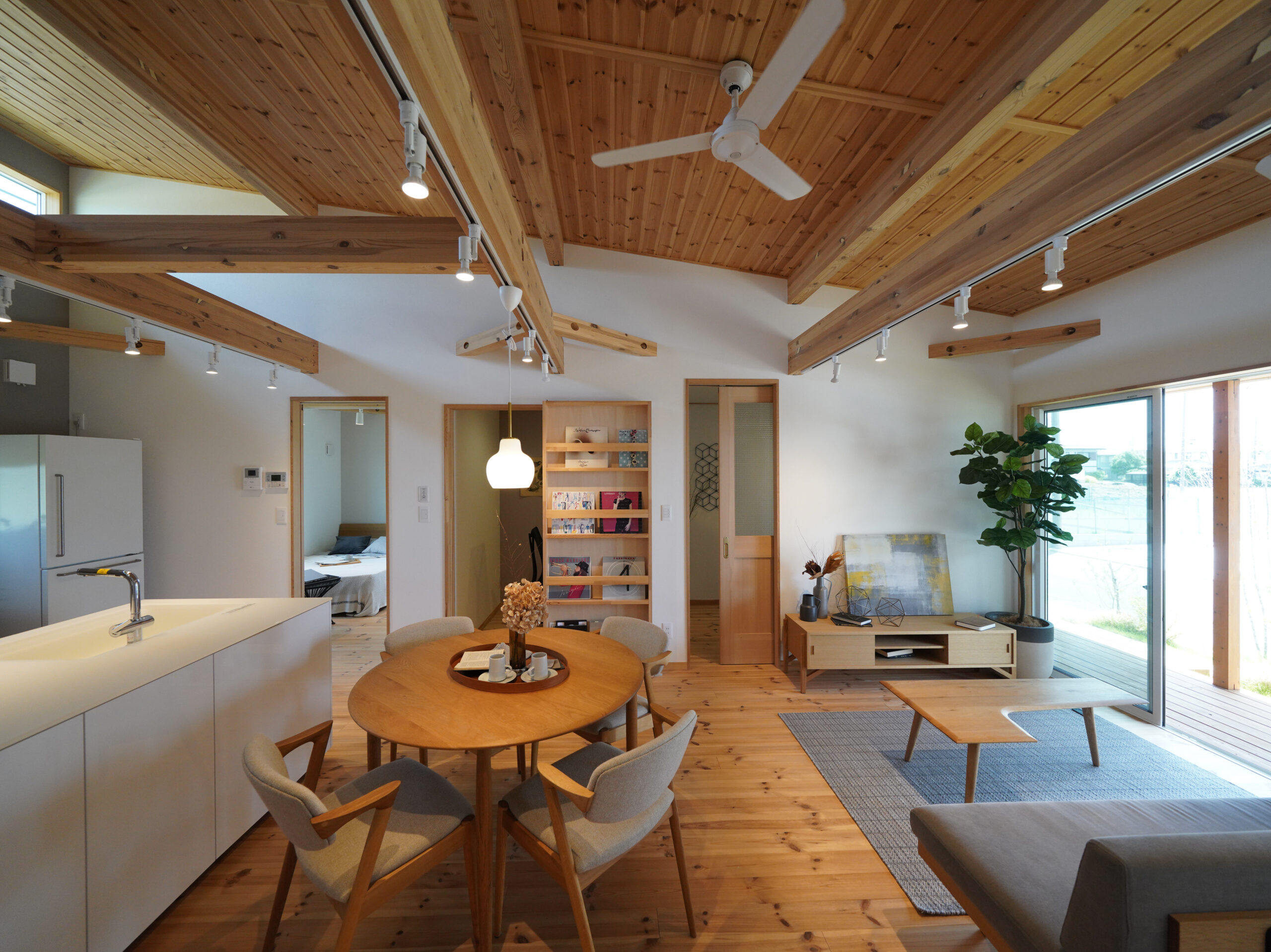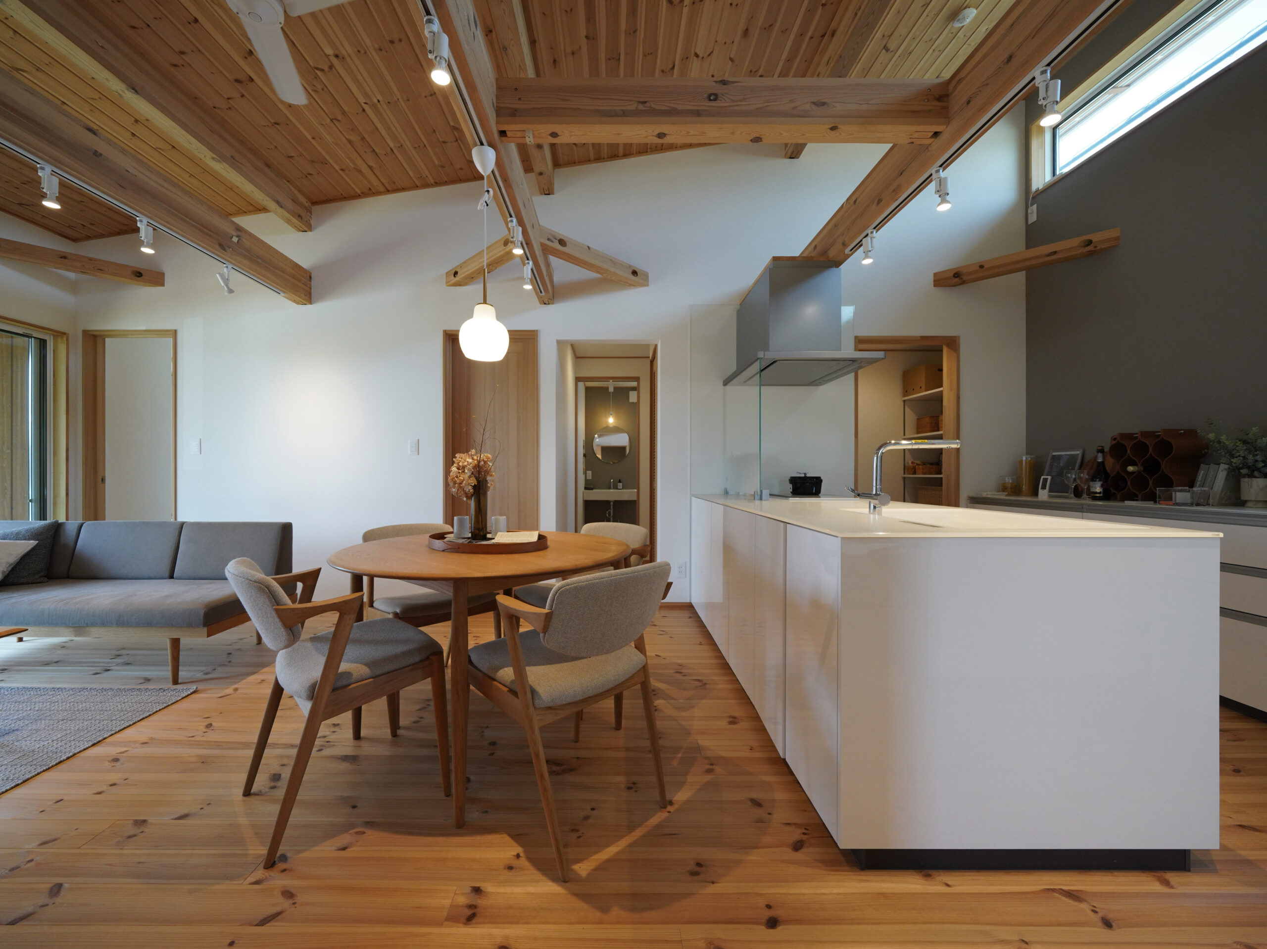 大きな開口と深い軒が、室内にやわらかな光と風を招き入れ、庭とひと続きの心地よさをつくります。