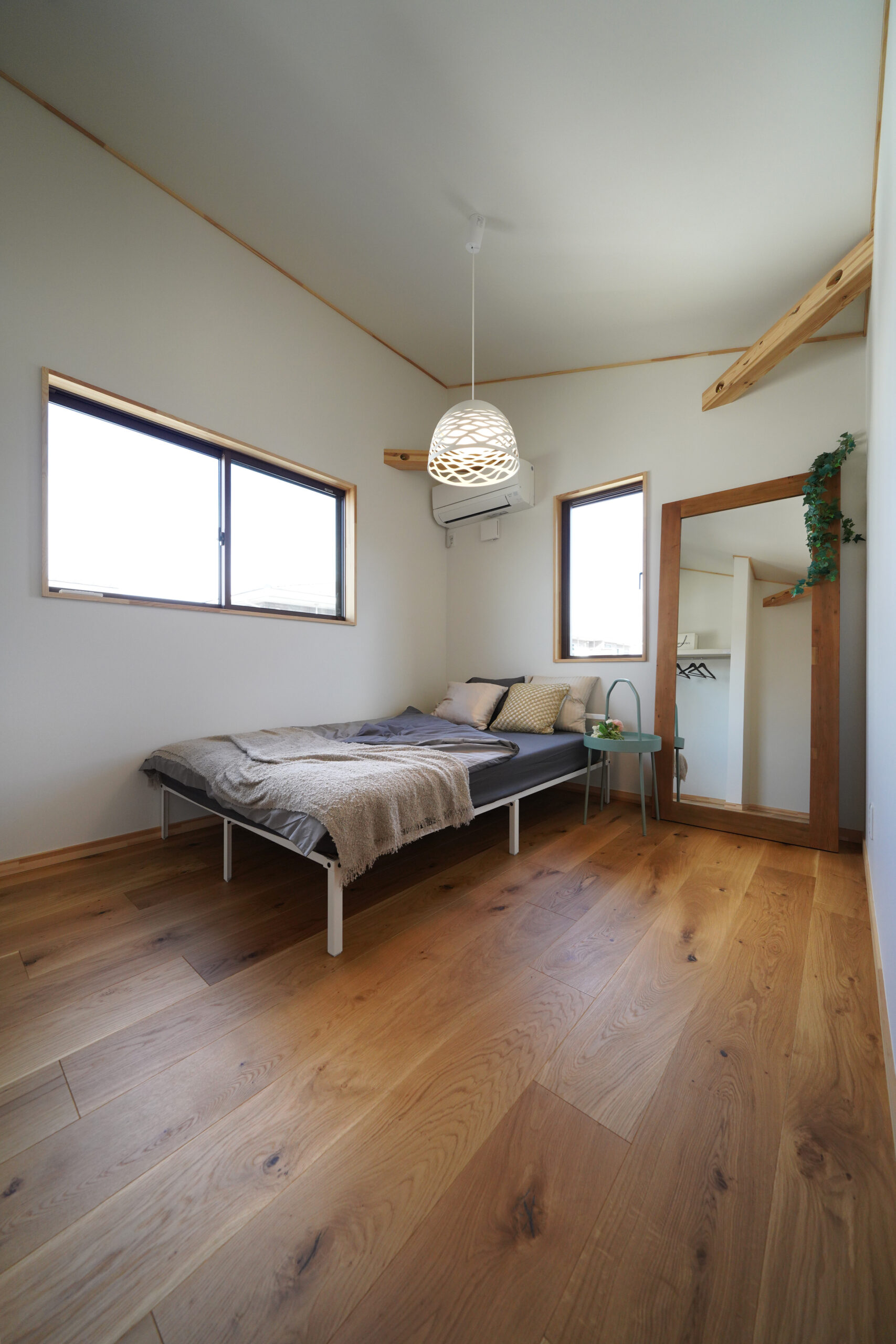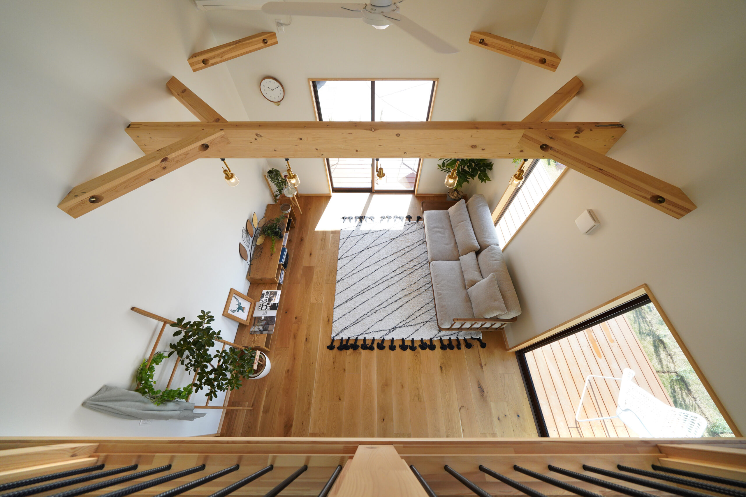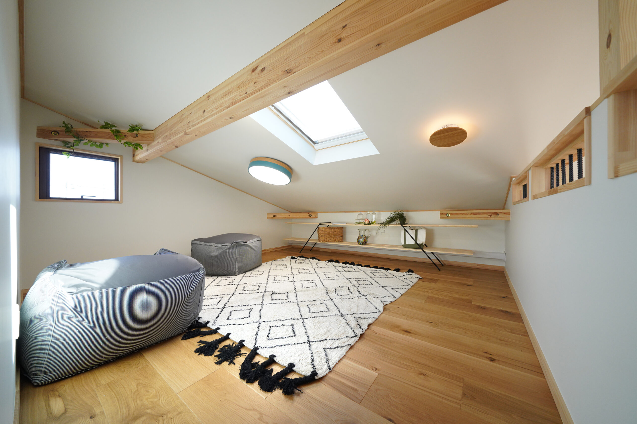 ゆるやかな勾配天井と吹き抜けが生むのびやかな一体空間に、ロフトの+αがリモートワーク・趣味・収納まで柔軟に応えます。