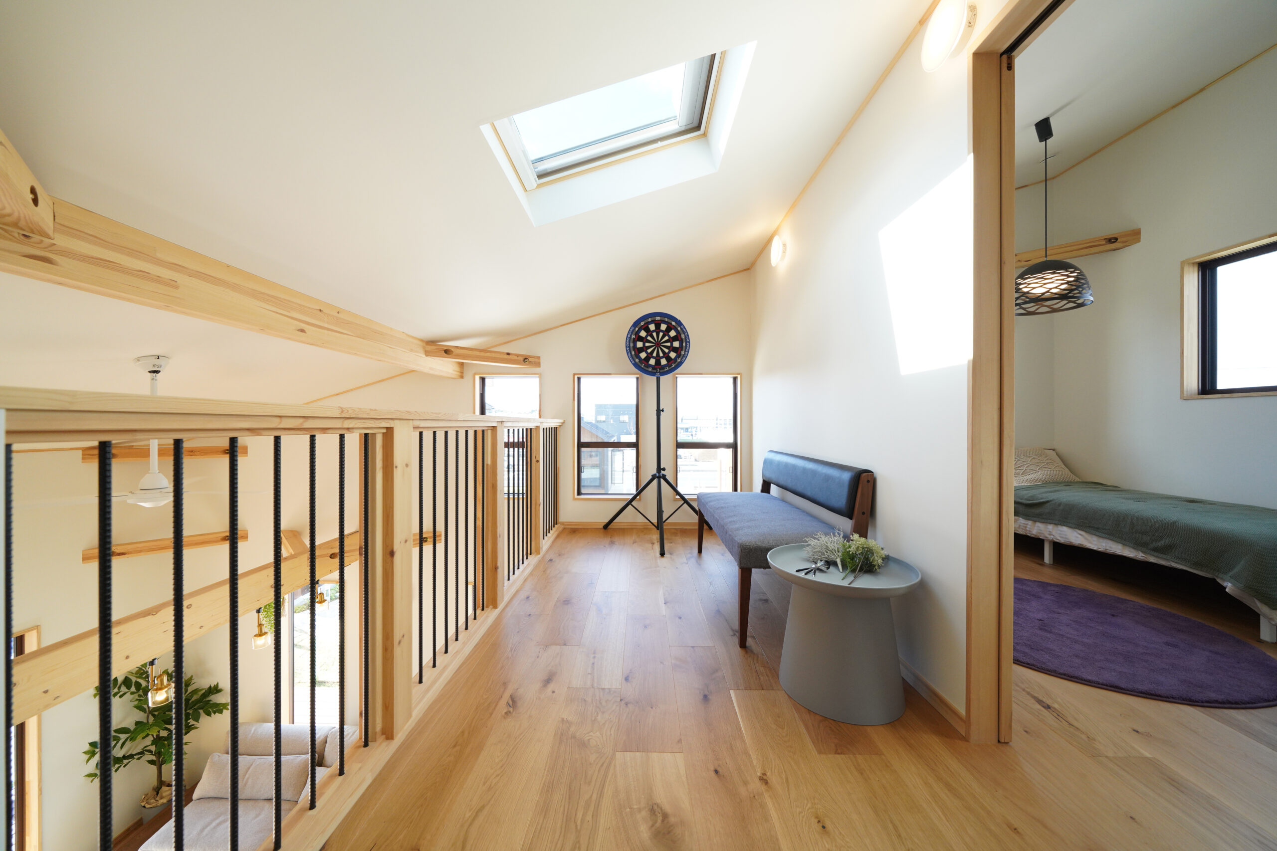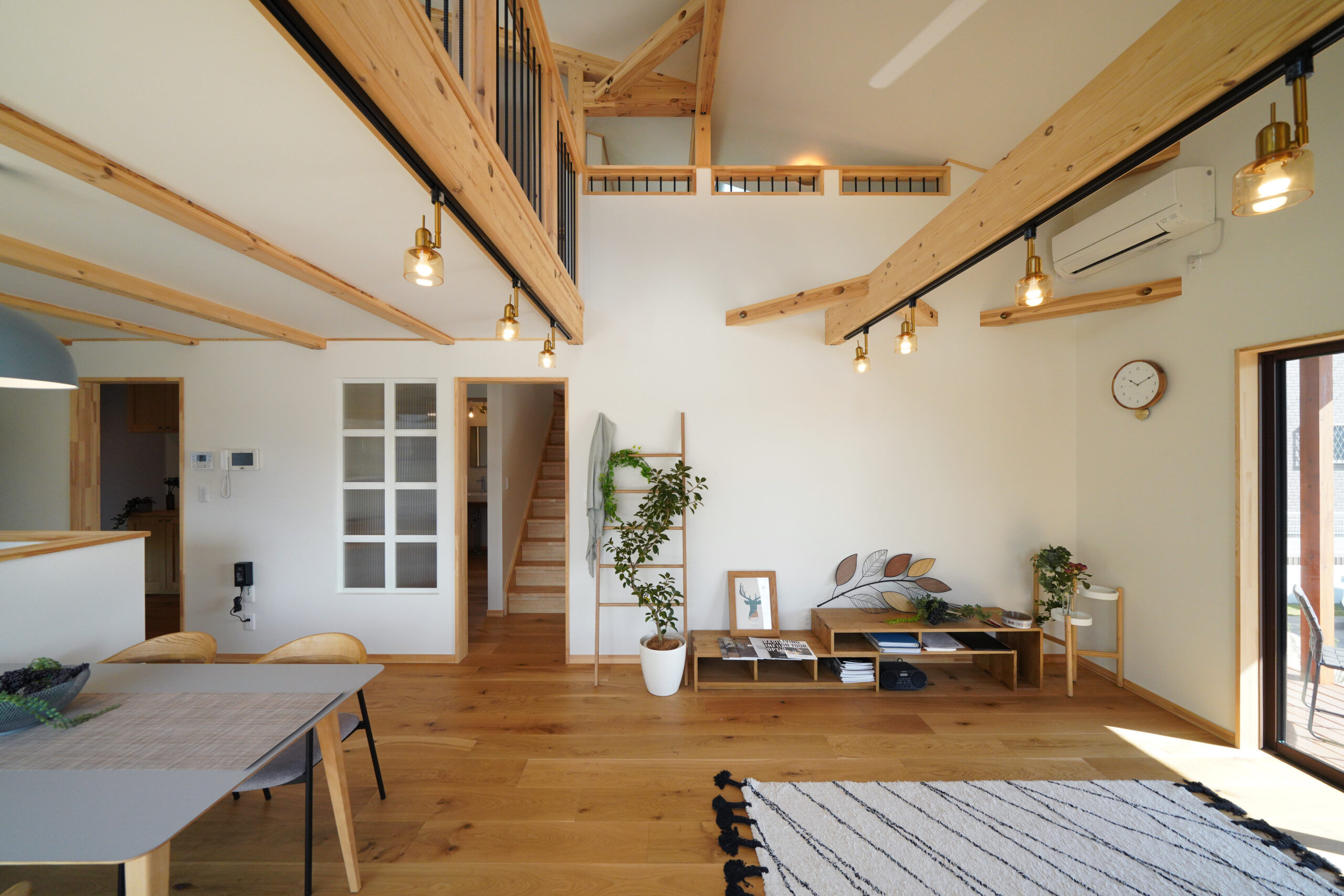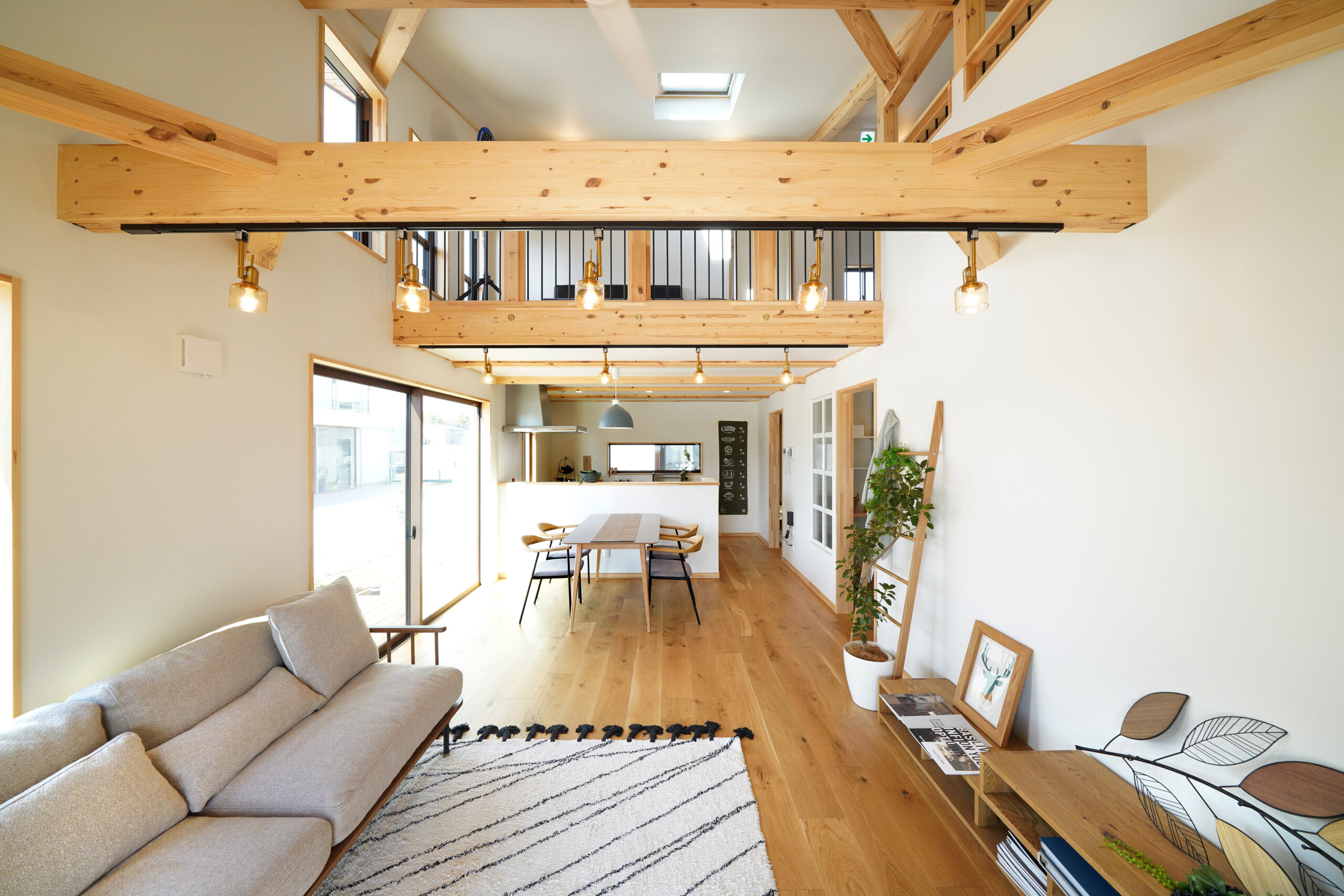 大屋根の下、吹き抜けがもたらす開放感とロフトの“+α”で、ちょうど良い広さと可変性を両立。家族の気配を感じながら、自分時間にも切り替えやすい一体空間です。 -